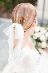 Add a fun touch to your bridal look with this bow-adorned tulle and pearl veil that attaches with a simple clip.